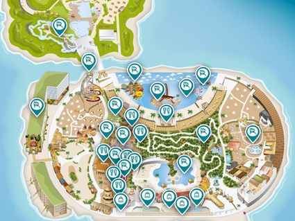 Genieße entspannte Stunden am 200 m langen Sandstrand, während du in der warmen Sonne liegst und das türkisfarbene Wasser der Lagune auf dich wartet. Für noch mehr Badespaß sorgen ein Strömungskanal, mehrere Whirlpools und zwei unterirdische Wasserrutschen, die deinen Besuch zu einem echten Erlebnis machen.